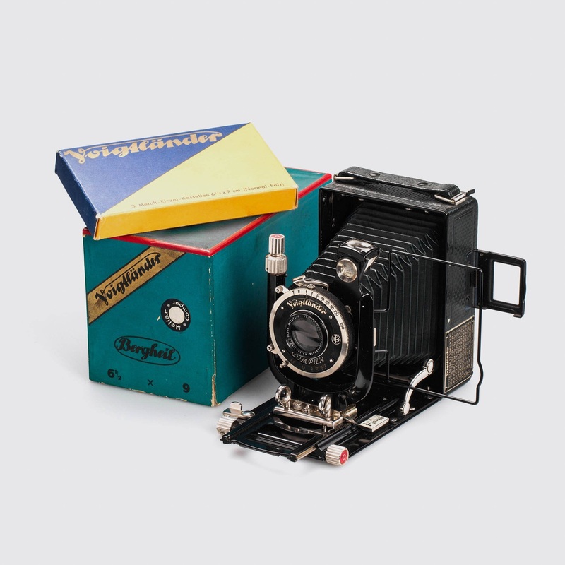 --- Unused camera with green leather covering, Heliar 4.5/10.5cm in Compur shutter, three brand new film holders in box, green/gold Bergheil maker's box. --- A- --- c.1930 ---