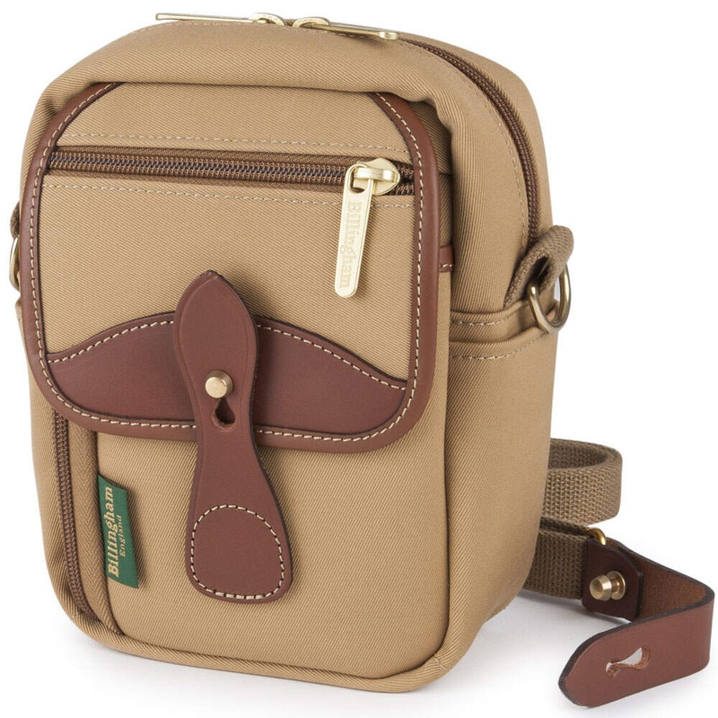 Experience the convenience and functionality of the Billingham Compact Stowaway - Khaki / Tan, a must-have for daily use or travel. With hidden pockets and zips, this camera bag is made in England with waterproof fabric and leather for the ultimate protect