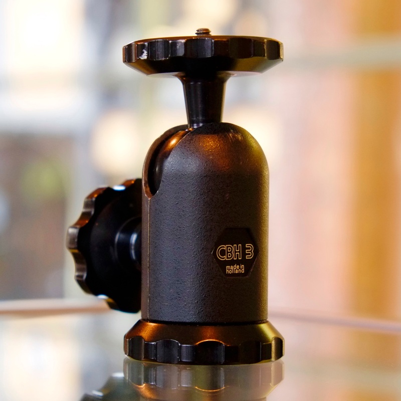 The Cambo CBH-3 is a surprisingly compact, super-sturdy ball head. It's designed to hold a 4x5 camera, but it can be used for pretty much anything else, within reason. The base has an inner 3/8" thread for mounting to legs of your choice; the camera mount