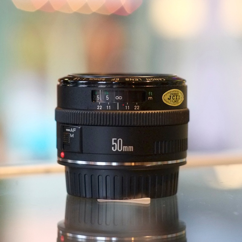 Ye Olde Schoole Canon EF 50mm f1.8 is a sturdy little lens with a metal mount- definitely a better-made unit than the infamously lightweight II version.In excellent condition, with only minor wear.