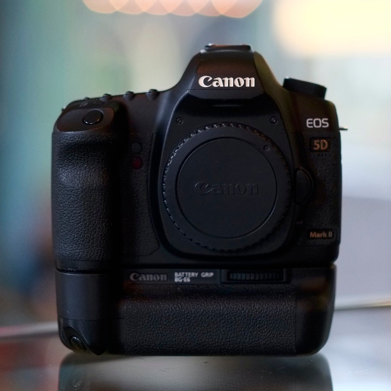 The Canon EOS 5D Mark II is an easy to handle full-frame camera that shoots 20mp stills and video at up to 1080P30. It features a sturdy metal body, plenty of physical control buttons for quick on-the-go adjustment, and uses common, reliable LP-E6 batterie