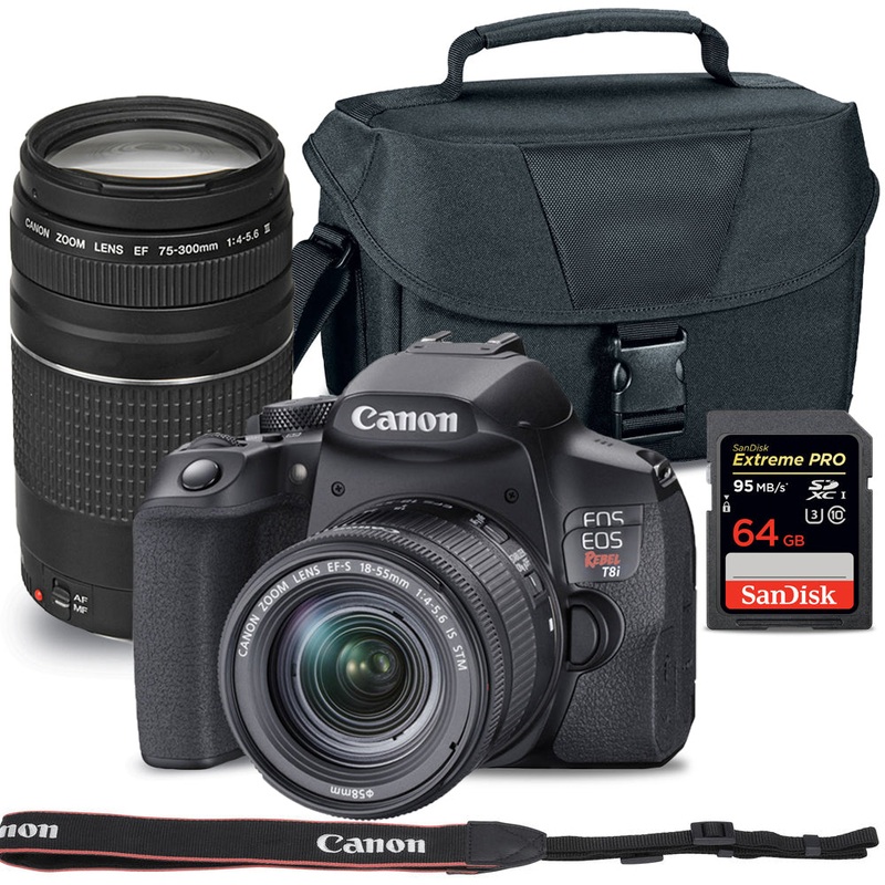 Canon EOS Rebel T8i with 18-55mm + 75-300mm III + Large Carry Case + 64GB Bundle