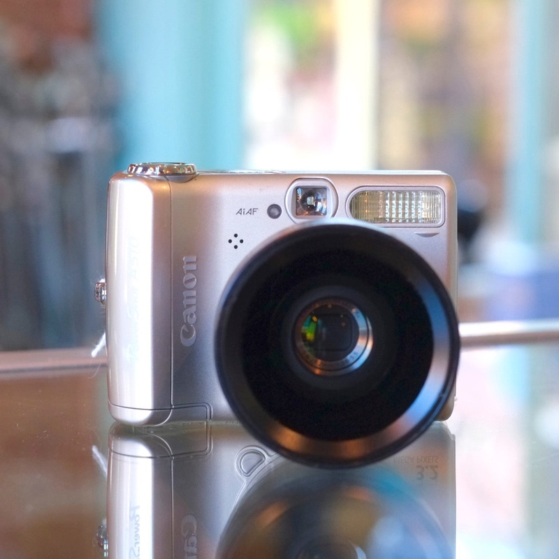 The Canon Powershot A510 is a simple digital point-and-shoot camera with a 3.2mp sensor and a 4x zoom lens... nothing fancy. But it runs off a pair of standard AA batteries, and this one includes a Canon Wide Converter WC-DC52, which makes it a bit more fu