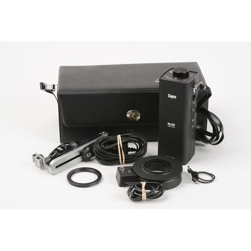 Excellent++ ConditionUniversal Capro Rl80 Macro Ring LightIncludes AC Adapter, Synd Cord, Case, And 52mm To 62mm Step-Ring Adapter And Folding Grip(Mount On 52mm Diameter Lenses Or 62mm With Adapter IncludedFully tested, works greatClean battery chamber (C