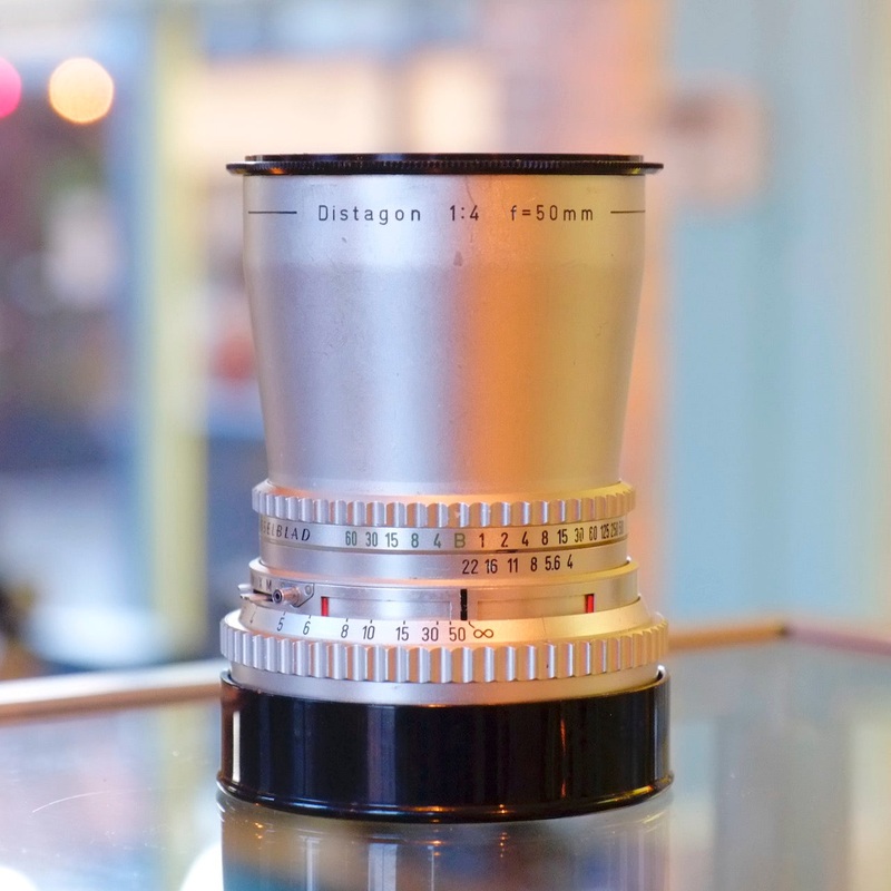 This Carl Zeiss C Distagon 50mm f4 lens for Hasselblad V series cameras has a good shutter and smooth focusing, but does have some internal patterned haze and some cosmetic wear including a dented filter ring.