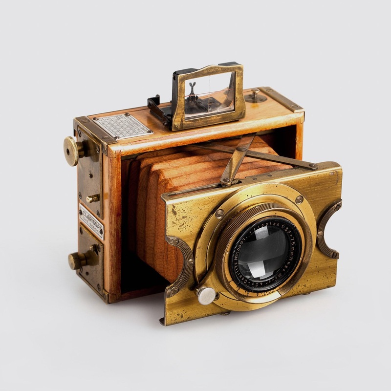 Rare compact tropical camera in teak/brass finish for plates 4.5x6cm, brown leather bellows, focal plane shutter to 1/1000 sec. --- In excellent original condition with fast Trioplan 3/75mm no.13351. --- B --- c.1927 ---