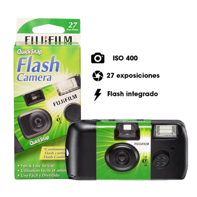 La cmara desechable Quicksnap Flash 400 est cargada con un rollo de 27 exposiciones de la pelcula negativa de color Fujicolor Superia X-TRA 400. Cuenta con un diseo compacto y porttil, ideal para llevar a todas partes. Incorpora un lente gran angular de enfoque fijo y un visor ptico, adems del flash con alcance de hasta 3 metros. Posee control manual de encendido y apagado.