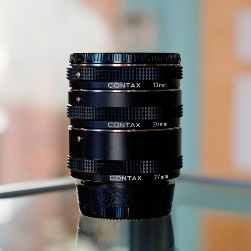 The Contax auto extension tube set for Contax-Yashica mount includes one each of 13mm, 20mm, and 27mm tubes- for a maximumof 50mm of extension. In excellent condition.