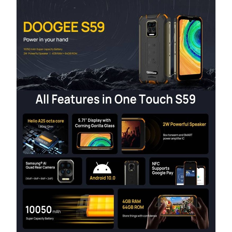 DOOGEE S59 is IP68, IP69K and MIL-STD-810G certified. It is exceptionally resistant to damage caused by falls, water immersion and rinsing, shock and impact.