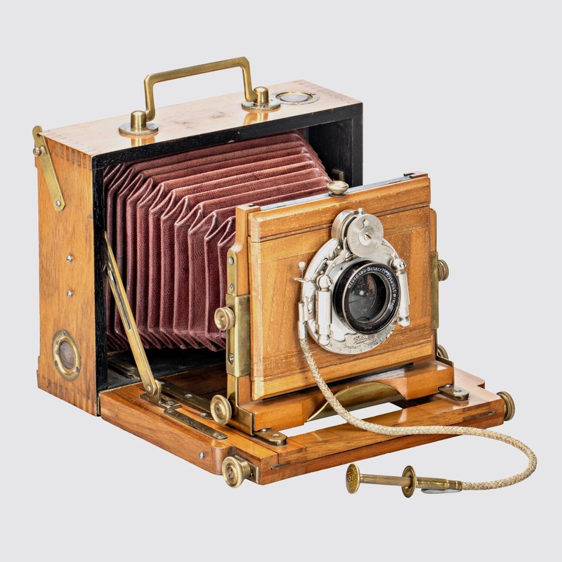 --- Beautifully designed, unmarked (Gaumont folding block system) 9x12cm camera, teakwood body with brass fittings and handle, red-brown leather bellows, Ernemann Detectivaplanat lens in nickel Ernemann Patent Pneumatic Bob shutter. --- B+ --- c.1905 --- -