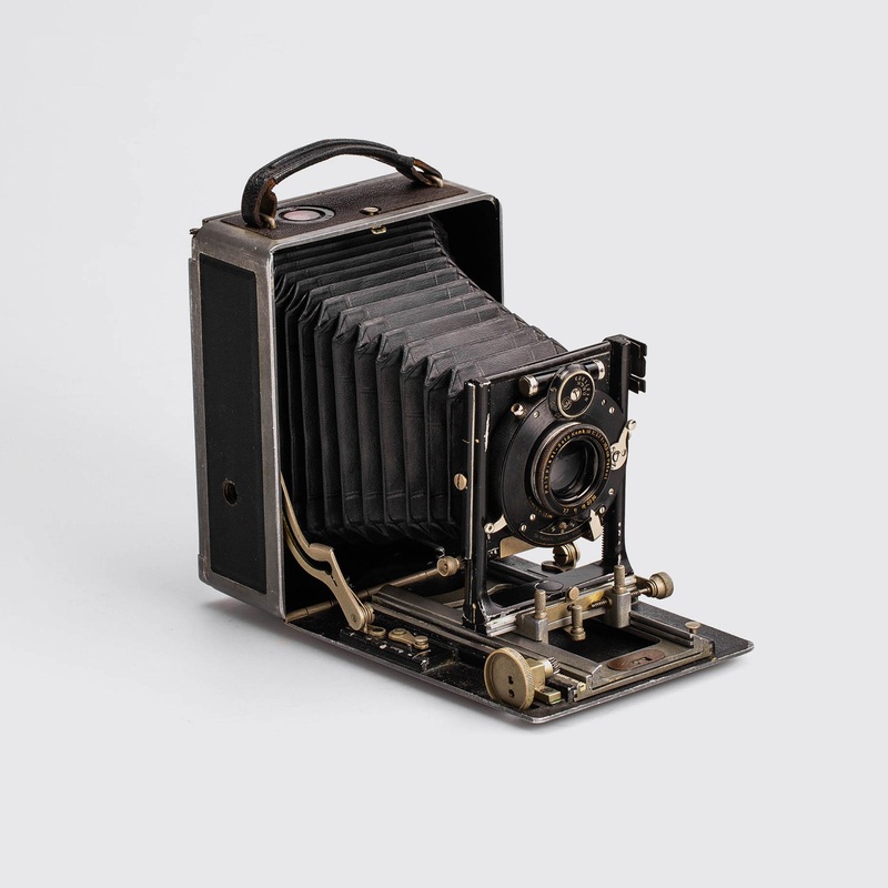 The German company Edelmann produced metal folding plate cameras from 1913-1921, very few are known to exist. — Zink-metal construction, partly covered with grey leather, for plates 9x12cm, with Polyplast-Satz Komb.III lens 16.5/22cm lens in Staeble Dial-set Compur shutter, front door engraved ‘EDELMANN MNCHEN’. — B- — c.1915 — — Die deutsche Firma Edelmann produzierte von 1913-1921 Metall-Klappkameras, von denen nur sehr wenige bekannt sind. — Zink-Metall-Konstruktion, teilweise mit grauem Leder berzogen, fr Platten 9x12cm, mit Polyplast-Satz Komb.III-Objektiv 16,5/22cm in Staeble Dial-set Compur-Verschluss, Frontklappe graviert ‘EDELMANN MNCHEN’.