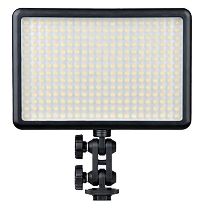 Godox LF308 OverviewThe Godox LF308BI Daylight LED Video Light with Flash Sync features 154 daylight-balanced and 154 tungsten-balanced LED bulbs that provide a bright output in a lightweight package. It features a built-in L-series battery plate (battery