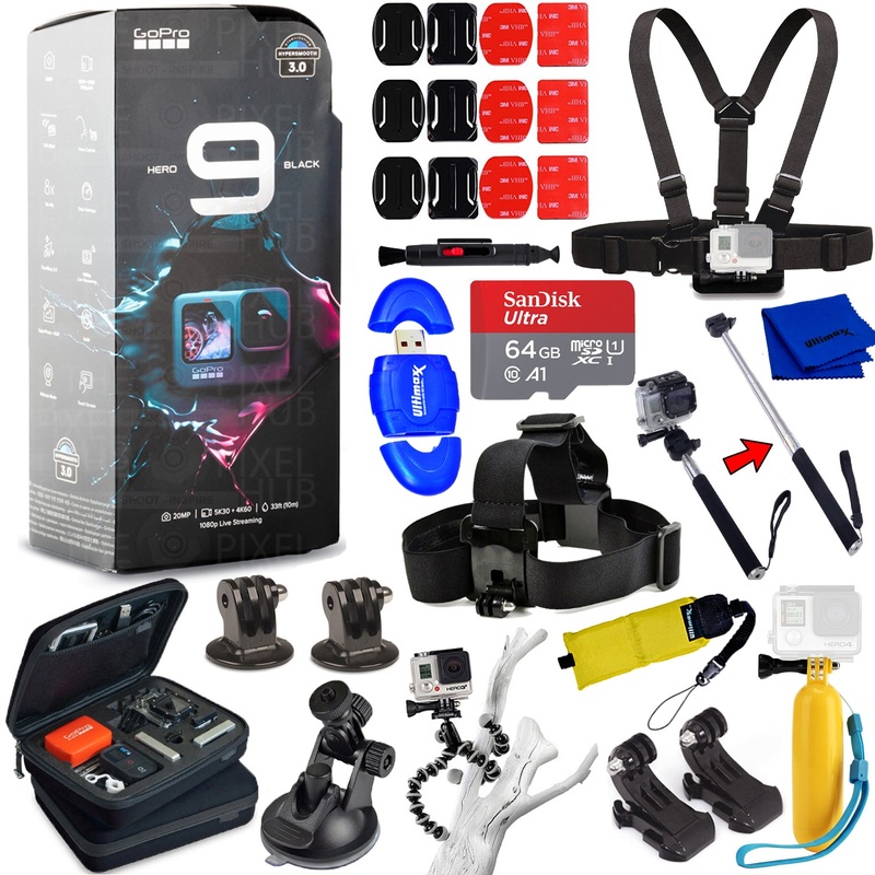 Short Description23.6MP Sensor, 5K30 Video & 20MP PhotosLive View Front Display/Rear TouchscreenWebcam Mode & 1080p Live StreamingHyperSmooth 3.0 Image StabilizationKit IncludesGoPro HERO9 BlackSandisk Ultra 64GB Micro SDXC UHS-I Card with Adapter - 100MB/