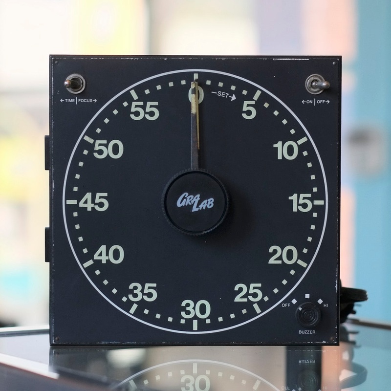 The classic darkroom timer, with an easy-to-read dial, switched outlet, loud buzzer and no-nonsense direct controls (no beep-booping here). In good working order, with some cosmetic wear and corrosion, but it looks good with the lights off!