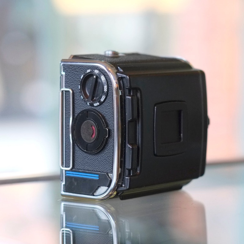 This is achrome Hasselblad E12-6x6 back ingood working order, with some cosmetic paint and finish wear: most notably, as seen in the image, some of the rubber trim on the bottom corner is missing. This is purely cosmetic- it's just covering. Matching inser