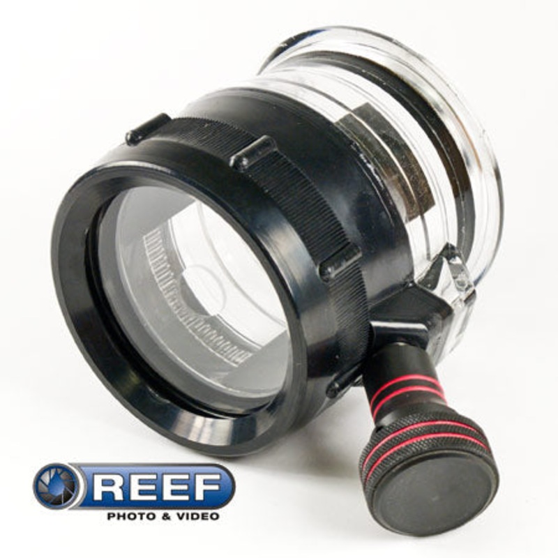 This flat port features a focus knob/gear assembly for manual focus with the Canon 100mm USM Macro.