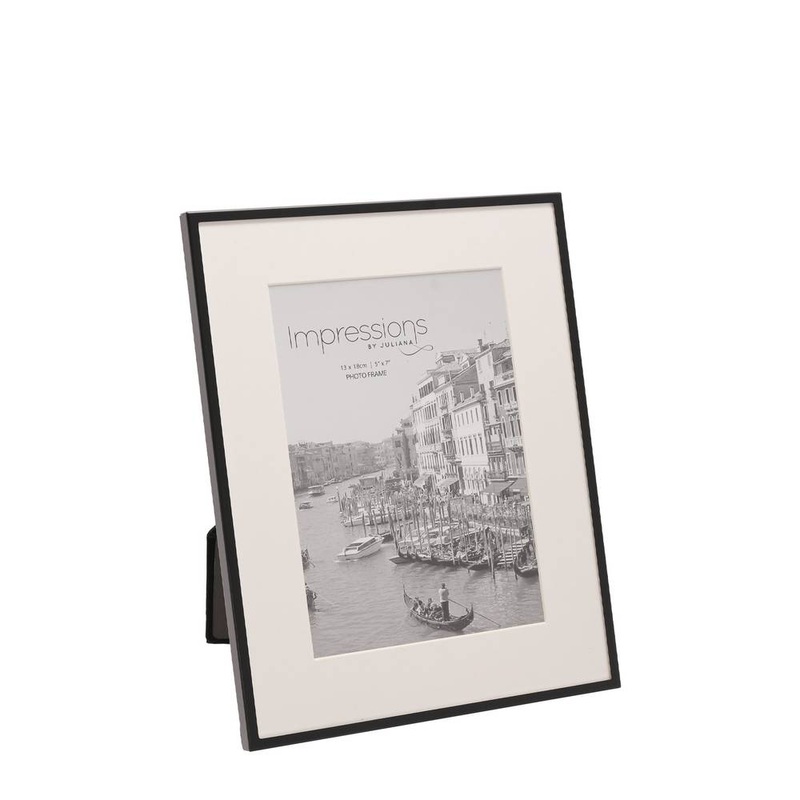 Display your treasured pictures in style with Impressions' matt black photo frame. The metal photo frame is equipped with a matt finish, crisp white mount and sleek black velveteen strut for a contemporary and polished look. This black photo frame is ideal