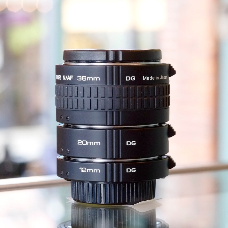 A set of three extension tubes for Nikon F mount: 12mm, 20mm, and 36mm. These tubes have the electronic contacts necessary to maintain autofocus and autoexposure capabilities. If you're curious about dabbling in macro work, this is an inexpensive way to ge