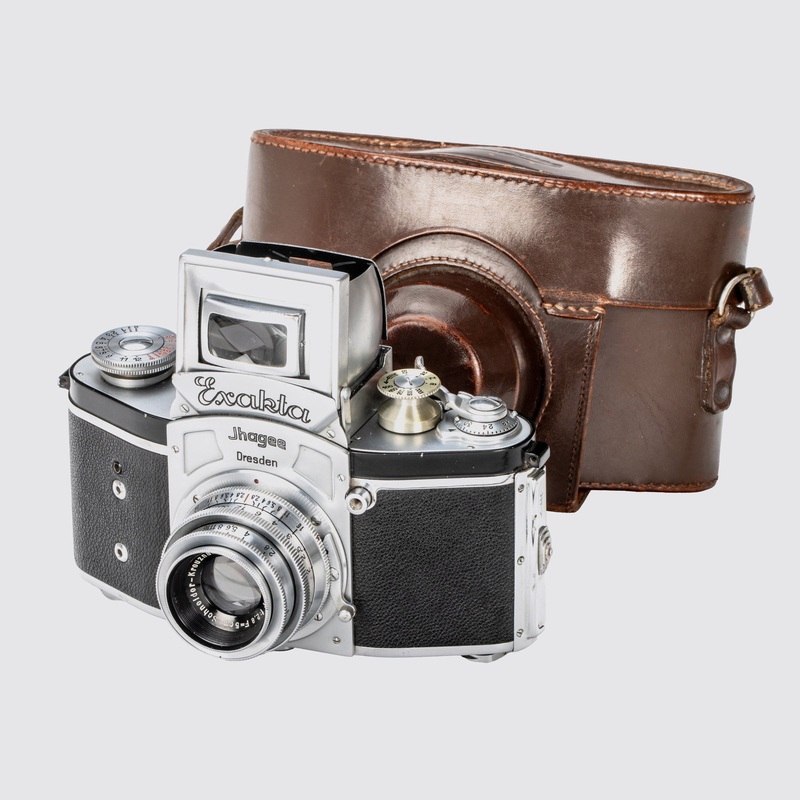 — Near mint Kine Exakta with Xenar 2.8/5cm no.1158071, shutter needs attention, leather case. — A- — c.1937 — 532365 — Fast neuwertige Kine Exakta mit Xenar 2.8/5cm Nr.1158071, Verschluss kann repariert werden, Ledertasche.