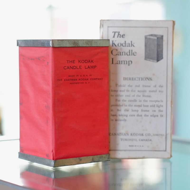 The Kodak Candle Lamp is a candle-powered darkroom safelight. Complete, with some staining on the fabric, light finish wear on metal parts. Should you actually use it? I don't know, but it includes an original candle if you're feeling lucky. With box.