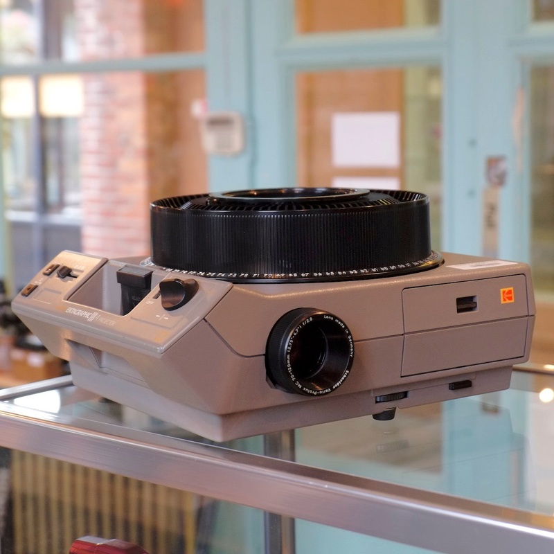 The Kodak Ektagraphic IIIA is a late model 35mm slide projector built for commercial and industrial use: heavy, but excellent. This one's in nice shape, and includes a wired remote control, Schneider Vario-Prolux MC 70-120mm f2.8 lens, and an 80-slide tray