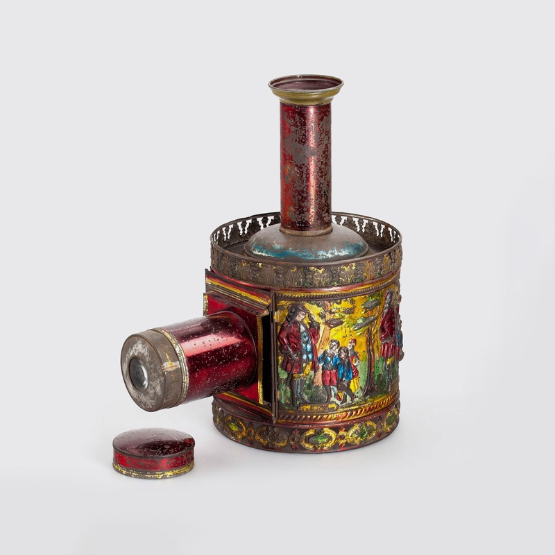 The lantern is decorated with children dressed in 18th century costumes surrounding their teacher. The French magic lantern and slide manufacturer and metalworker Louis Aubert took over the business of a colleague metal worker when he opened a shop in Pari