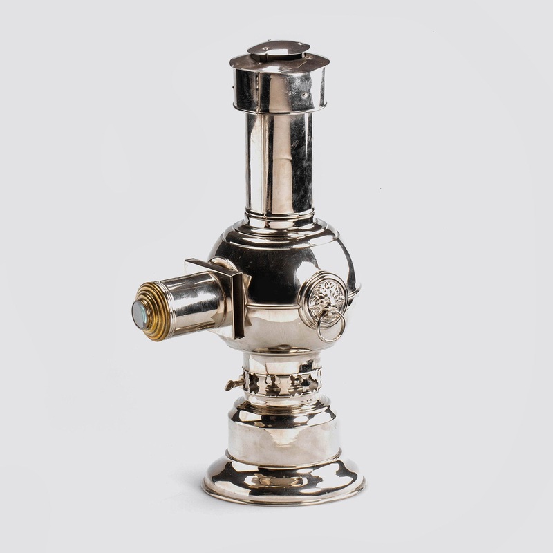 The Lampadophore is a lampascope, complete with its own oil lamp base. It was made in distinctive nickelled brass and is embossed with a lion's head and a ring-shaped handle on either side of the lamp house. --- In beautiful, neat mint and complete conditi
