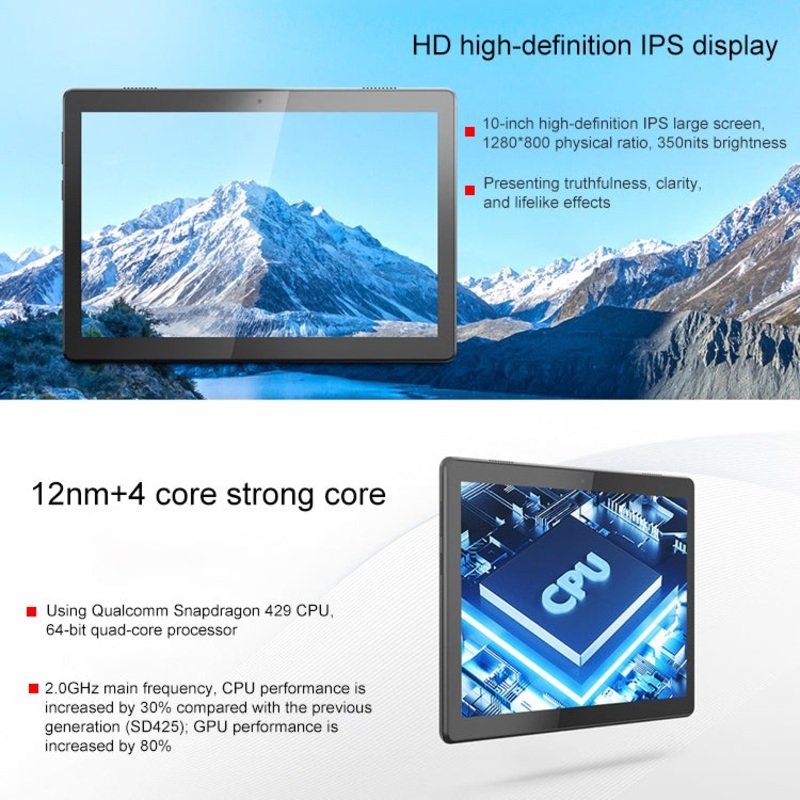 Android 9.0 operating systemQualcomm Snapdragon 429 4-core 2.0GHz processor3GB RAM + 32GB ROM, support an external Micro SD card up to 128GB (not included)10.1 inch IPS screen, HD 1280x800 resolutionSupport 2.4GHz & 5GHz WiFi, BT4.2Powered by 4850mAh lithi
