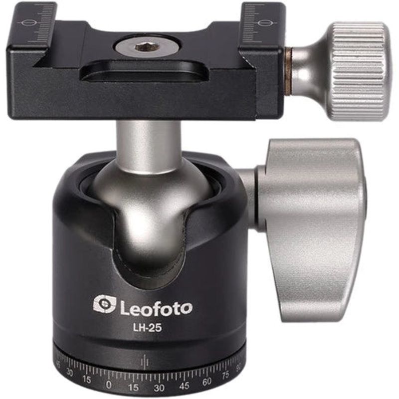 Leofoto LH-25OverviewKey FeaturesLoad Capacity: 13.23 lbHeight: 2.6"Weight: 6 ozScrew-Knob Clamp for 25mm PlatesPans 360Single Notch for Tilting 903/8"-16 Tripod Mount & 1/4"-20 AdapterAnodized Aluminum ConstructionMade of aluminum with an anodized finish