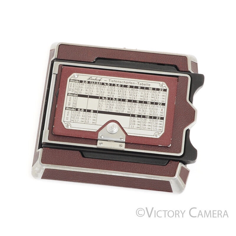 This is the shade off of a 6x9 Super Technika III.It is in excellent cosmetic condition with light wear. The shade is light tight, but there is no ground glass. It will need to be replaced for the shade to be effective. This is an as is sale for parts or r