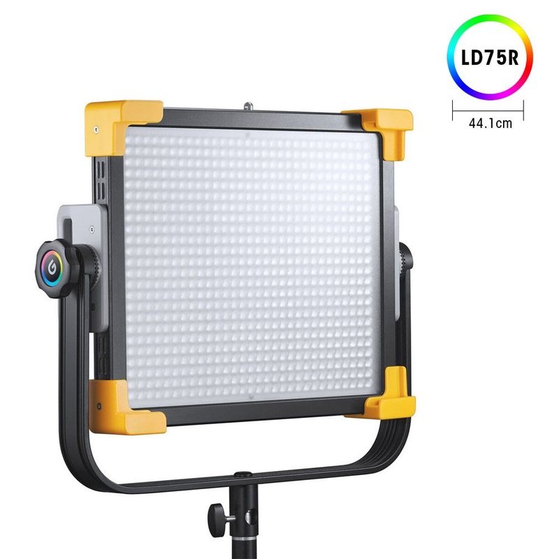 La lmpara LD75R de la marca Godox es ideal para crear una iluminacin grandiosa, ya que cuenta con un control preciso del color en distintos modos como el CCT, RGB, HSI, R-Gel, L-Gel y FX. Cuenta con un tamao del panel de 44.1 x 41.0 x 10.75 cm y sus ndices CRI/TLCI son de 96/97. Es una lmpara fcil de transportar de un lugar a otro ya que cuenta con una maleta para cargarla fcilmente.