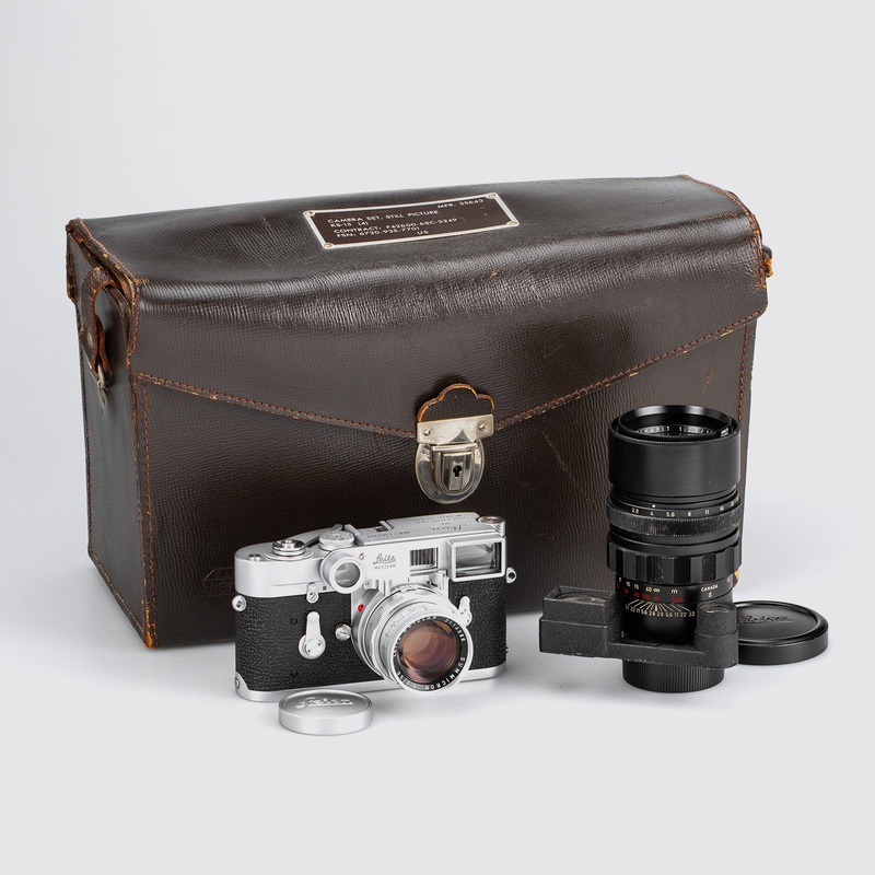 — Very rare M2-S with M4 rapid load system in beautiful and perfect working original condition, clean finder. This special camera, a late M2 with selftimer was made for the United States military and designated KS15-4 . It comes with the matching close focus Summicron 2/50mm no.2114986 with attachment in very fine condition with clean optics, matching Elmarit 2.8/135mm no.2038264, with original outfit leather case with metal plate ‘CAMERA SET, STILL PICTURE KS-15 (4) and US contract numbers. — B/A — 1966 — 1163117 — Sehr seltene M2-S mit M4 Schnellladesystem in schnem und perfekt funktionierendem Originalzustand, sauberer Sucher. Diese spezielle Kamera, eine spte M2 mit Selbstauslser, wurde fr das US-Militr hergestellt und als KS15-4 bezeichnet. Sie kommt mit dem passenden Summicron 2/50mm mit Vorsatz in sehr gutem Zustand mit sauberer Optik, passendem Elmarit 2.8/135mm Nr.2038264, mit originaler Ledertasche mit Metallschild ‘CAMERA SET, STILL PICTURE KS-15 (4)’ und US Vertragsnummern.