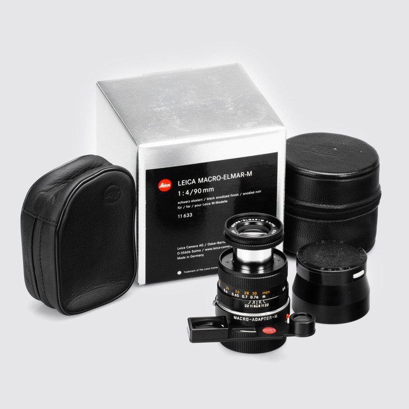--- Near mint macro-lens with perfect optics (no scratches, no fungus, no separation and no haze), caps, hood, leather case, maker's box, with Macro-Adapter M with leather case. --- A- --- 2003 --- 3969508 --- Nahezu neuwertiges Makro-Objektiv mit perfekte