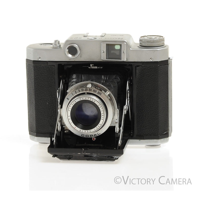 Here’s the original Mamiya Six, before they were made out of plastic. It is a unique camera that has bellows, focuses from the film plane rather than the lens, and has a small built-in waist level finder. All in all it is a very functional and interesting camera that folds up into a neat package.