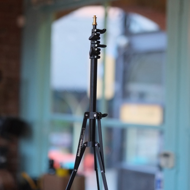 The Manfrotto 001B is a lightweight, collapsible stand that measures less than 20 inches when packed up, but extends up to about 6.5 feet (or about 1.8m) fully extended. In excellent condition, with light finish wear. Suitable for smaller lights.