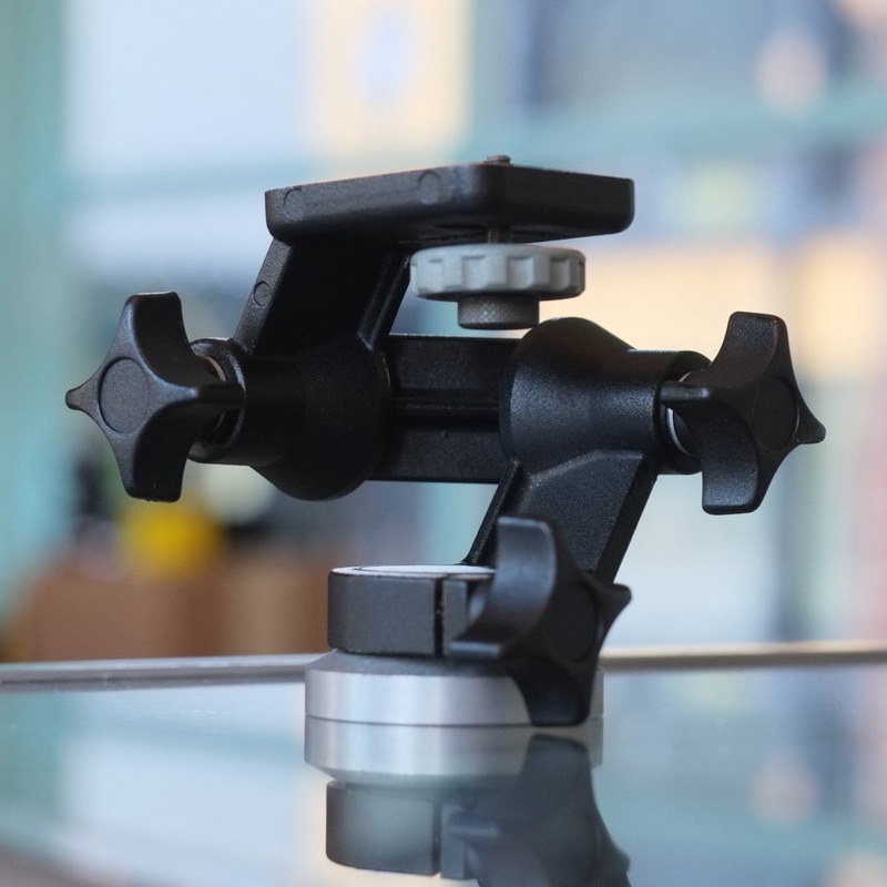 The Manfrotto 056 is a simple three-way tripod head for still cameras. Three low-profile knobs, thumbscrew (with standard 1/4" thread) for camera mounting. With the exception of the knobs, it's all metal. Cosmetic condition is very good, with minor paint w