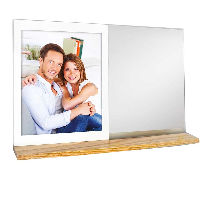 This is a terrific idea for any home and makes a great gift. A useful mirror on one side and a place for your favourite 10×8 inch photo on the other, what could be better? The glass front on the aperture, ensures that the photograph stays clean and protected and the high quality mirror on the right is perfect for everyday use. Measuring 18.5x12x3 inches overall, the width of the frame is approximately 1 inch top and bottom and then just under an inch on either side; this keeps all the proportions correct and means that the picture balances well with the frame. The upright frame is approximately half an inch deep, with the mirror safely recessed into it and the smooth edges of the mirror gives it a high quality, finished feel. The frame is made from MDF, which is painted off white, to contrast with the brown, light oak wood base, which is substantial enough to stand the unit safely.