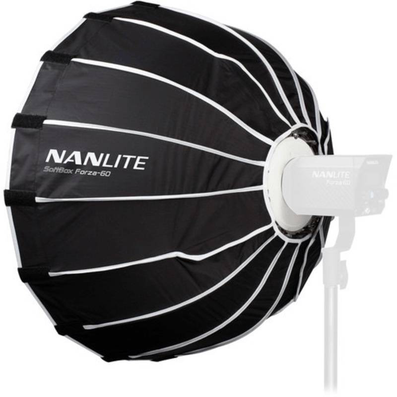 The Nanlite 23.6-inch Forza 60 Softbox, a 16-sided light modifier that produces focused, soft light with punchy, crisp edges, is ideal for interviews and portraits. The modifier's parabolic design produces significant falloff at the subject's edge, enhanci