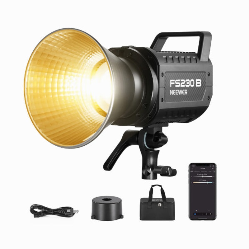Description 230W Powerful Compact Studio Light- NEEWER FS230B Continuous Video Light uses premium and efficient COB LEDs for exceptional brightness, high 230W output, and 110000lux/1mmaximum illuminance. The portable spotlight weighs only 3.8lb (1.7kg) and