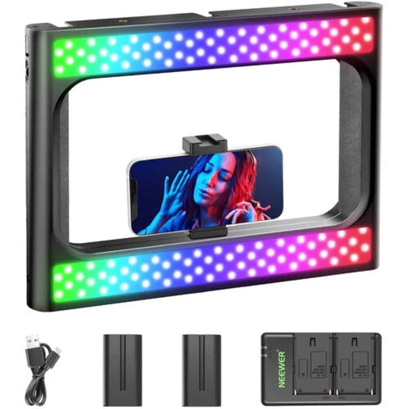 Neewer RGB-A111OverviewKey FeaturesFor Content Creators and VloggersLED Selfie Light with 600 Lux at 3.3'Smartphone Holder2500-10,000K, RGB Mode with HSI ControlMeasures 13.23 x 9.76 x 1.38"Charger and Two NP-F550 BatteriesWith its 13.23" x 9.76" x 1.38" f