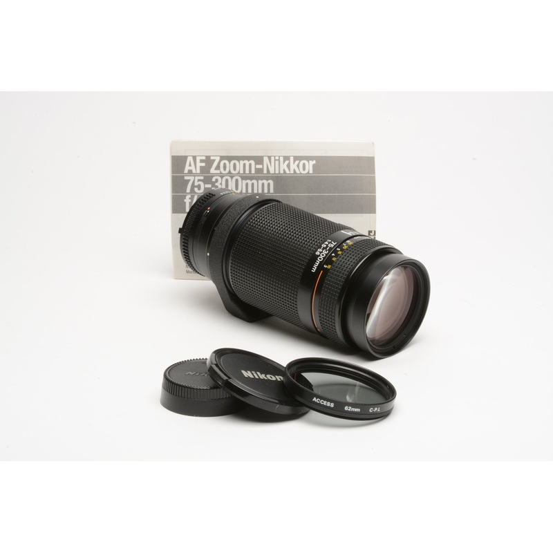 Nikon AF 75-300mm f4.5-5.6 zoom lens, caps, CPL filter, instructions, very clean