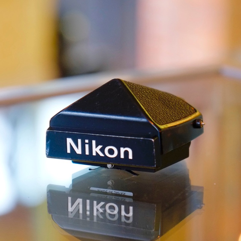 The Nikon DE-1 is the standard unmetered prism for the Nikon F2. This one is black, and is in excellent cosmetic condition, except for a very shallowindent on one side (visible in the image, and somewhat camouflaged by the leatherette covering) and some light paintwear on the same side. You may have noticed the “light prism marks” in the title, so let me explain what that means: there are a few small scratchesin the prism surface that would sit closest to the focusing screen. These do not affect function, but the marks kind of look like specks of dust through the viewfinder when in use. Does that sound like it might annoy you? If so, this one might not be for you. But if you think you can live with it, this is otherwise a nice looking prism.