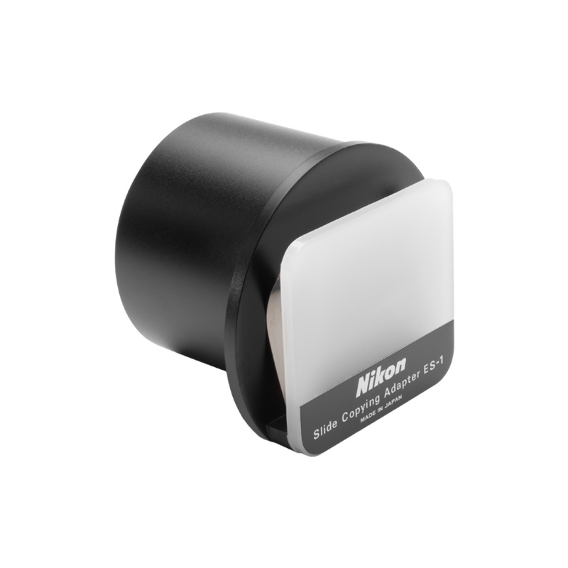 Nikon ES-1 Slide Copying AdapterAttached to the AF Micro-Nikkor 60mm f/2.8D lens with the BR-5 Ring or the Micro-Nikkor 55mm f/2.8 lens, this adapter enables duplication of 35mm film. Attaching the ES-1 to the Micro-NIKKOR 55mm f/2.8 lens and extension tub