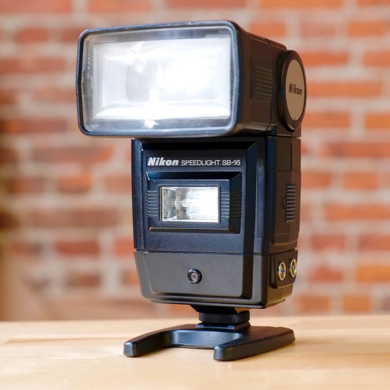 The Nikon SB-16 is a full-size flash for Nikon film cameras. It provides automatic function on select cameras (check your camera's instructions) and manual control for the rest- a versatile, powerful flash in good shape. Available in standard hot shoe moun