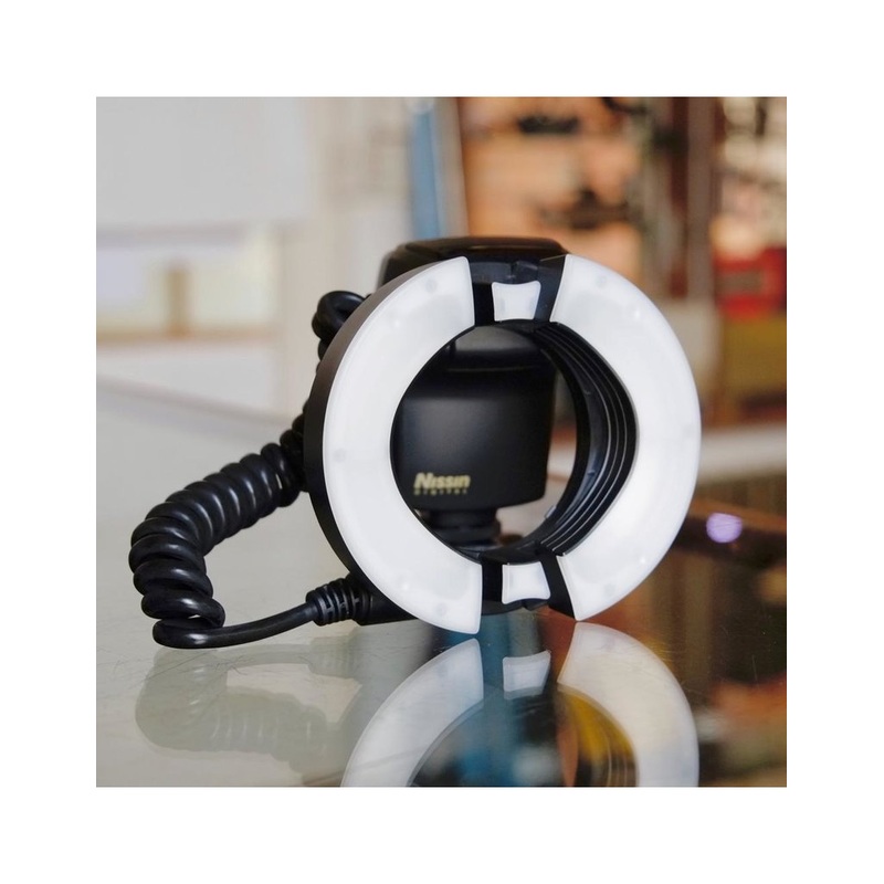 Nissin MF-18 Macro Flash for Canon EOS cameras, with adapter rings for 52mm, 58mm, 67mm, 72mm, and 77mm lens threads. This is a sophisticated modern macro flash with E-TTL/II or manual control, high speed sync compatibility, and optical TTL Master control