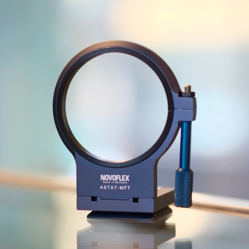 The Novoflex ASTAT-MFT is a tripod collar for select Novoflex adapters, specifically those for Fuji X, Micro Four Thirds, Nikon 1, and Pentax Q. It provides extra stability for long lenses when mounted to a tripod, with a built-in Arca compatible fitting i