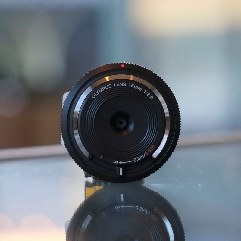 The Olympus 15mm f8 is a tiny wide angle lens for Micro Four Thirds cameras that's no bigger than a body cap, and it's pretty much designed to be used that way: it has no electronics, no autofocus, and a built-in sliding lens cover. Just about the smallest