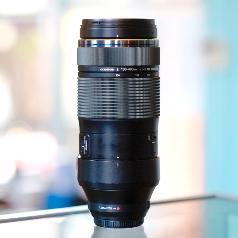 The Olympus M.Zuiko Digital 100-400mm f5-6.3 is a very long telephoto lens for Micro Four Thirds cameras: the "full frame" equivalent of 200-800mm. It features an effective image stabilizer, fast autofocus, and solid construction. The tripod foot even has