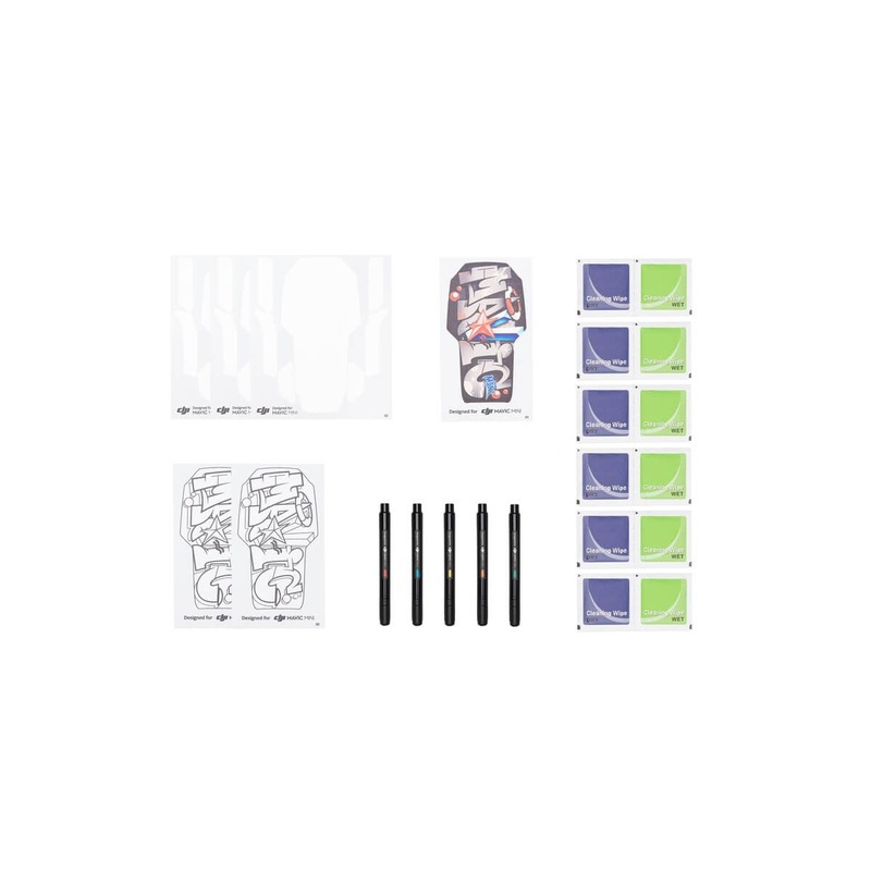 Long DescriptionAdd some flair and creativity to your Mavic Mini with this Mavic Mini DIY Creative Kit from DJI. The kit comes with six blank sticker skins that are die-cut in the shape of the Mavic Mini shell. Use the five included markers to draw your own unique design onto the stickers and apply them to the drone. The stickers are made from 3M Scotchcal film and are UV resistant. To help ensure the stickers are affixed to the Mavic Mini shell properly, DJI also includes six pairs of wet/dry cleaning wipes to prep the drone for application.