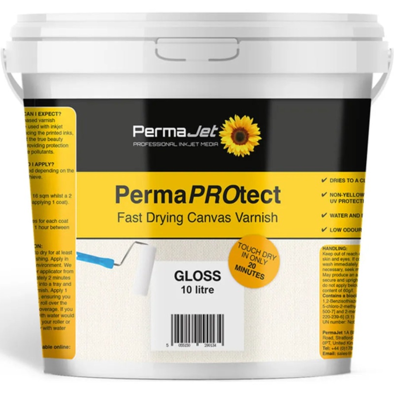 PermaJet PermaPROtect Varnish Gloss (10L) is a fast-drying, water-based varnish designed to protect and enhance inkjet canvas prints. With a clear, non-yellowing gloss finish, it shields against dirt, UV fading, fingerprints, and environmental pollutants,